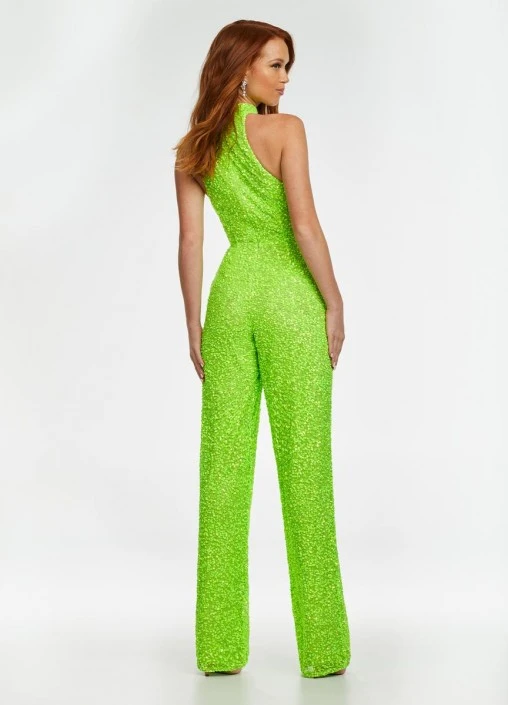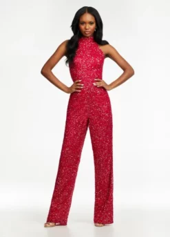 Style 1434 from Ashley Lauren is a fully hand beaded high neck halter jumpsuit. This modern jumpsuit has a sleeveless high back and straight leg pants, complete with pockets.