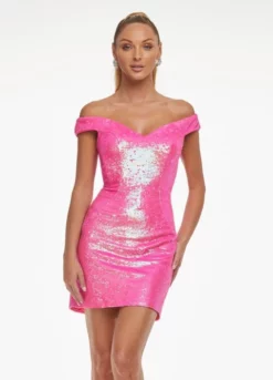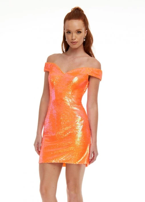 Style 4445 from Ashley Lauren is an off the shoulder sequin fitted cocktail dress with Ashley Lauren’s signature criss-cross cut out back. Dazzle the night away in this shimmering short dress that is sure to turn heads at your next event.