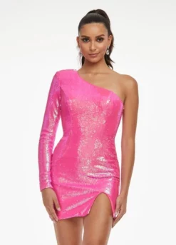 Style 4455 from Ashley Lauren is a fitted one shoulder sequin cocktail dress with one long sleeve. This is the perfect cocktail dress and the fitted skirt is completed with a mini left leg slit.