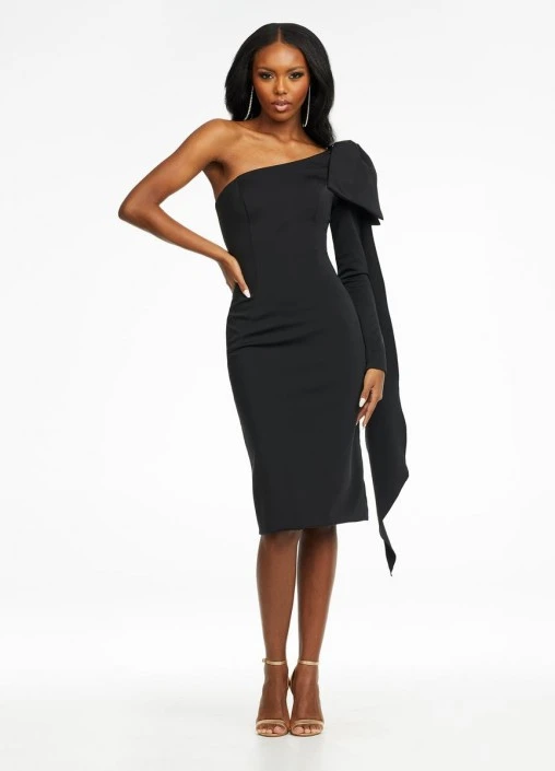 Style 4480 from Ashley Lauren is an elegant one shoulder cocktail length scuba evening dress that has a one long sleeve and shoulder bow detail. The tails of the bow fall below the sleeve for added elegance.