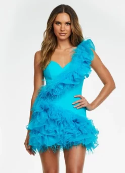 Style 4482 from Ashley Lauren is a one shoulder cocktail dress that has cascading ruffle detail from the shoulder to the full ruffle skirt. The ruffle is accented with feathers throughout.