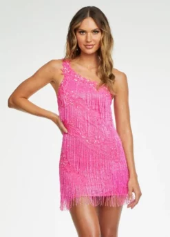 Style 4484 from Ashley Lauren is an elegant one shoulder cocktail dress covered with fringe and embellished with an intricate bead pattern.