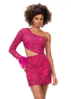 Style 4565 from Ashley Lauren is a fully beaded one shoulder cocktail dress with one long sleeve and a modern cut out at the waist. This look is complete with feather details on the wrist.