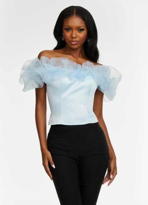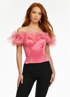 Style 9002 from Ashley Lauren is a separate ultra chic off the shoulder satin top that is accented by an organza puff ruffle along the neckline. This bustier would be perfect with jeans or for pageant headshots.