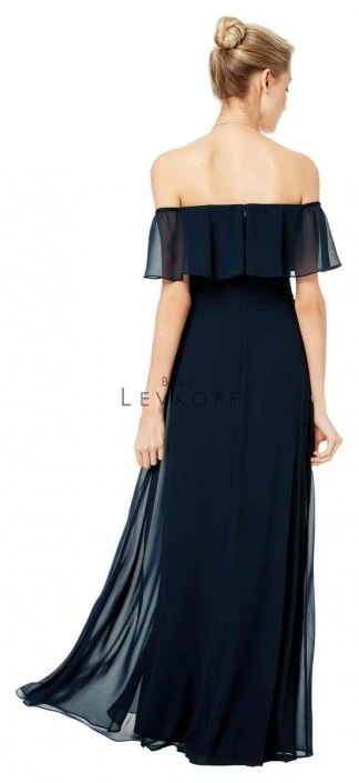 Style 1500 from Bill Levkoff is an off the shoulder chiffon bridesmaid gown with a ruffle bodice and an A-line skirt.