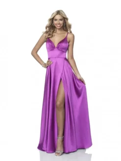 Style 11893 from Blush is a Stretch Satin A-line gown that has a wrapped skirt that has a slit, and a gathered V-neckline and a strappy open back.