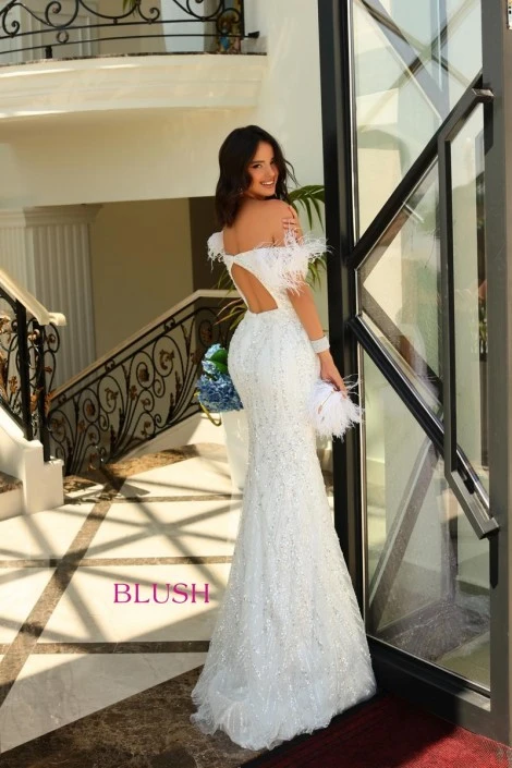 Style 20505 from Blush is an off-the-shoulder sequined tulle and jersey prom gown that has a V-neckline with mesh insert, cap sleeves with feather detail, fit and flare silhouette, keyhole open back, thigh high front slit, and a train.