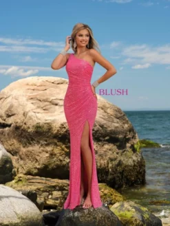 Style 20509 from Blush is a one-shoulder sequin beaded stretch net and jersey prom gown with an asymmetrical neckline, side ruched bodice, narrow straps that tie on the open back, thigh high front slit, and a train.