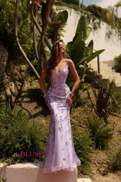 Style 20515 from Blush is a novelty patterned crystal ice on tulle prom gown that has a plunging neckline with mesh insert, fit and flare silhouette, wide straps, open V-back, and a train.