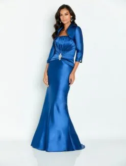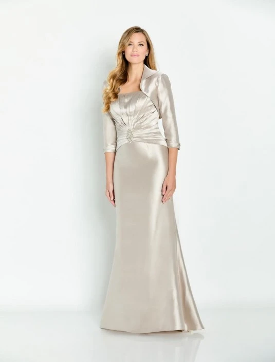 Style CB134 from Cameron Blake is a soft Mikado mother-of-the-bride gown with a strapless curved neckline, pleated bodice with jeweled pin, and a fit-n-flare silhouette. A three quarter sleeve bolero jacket is included.