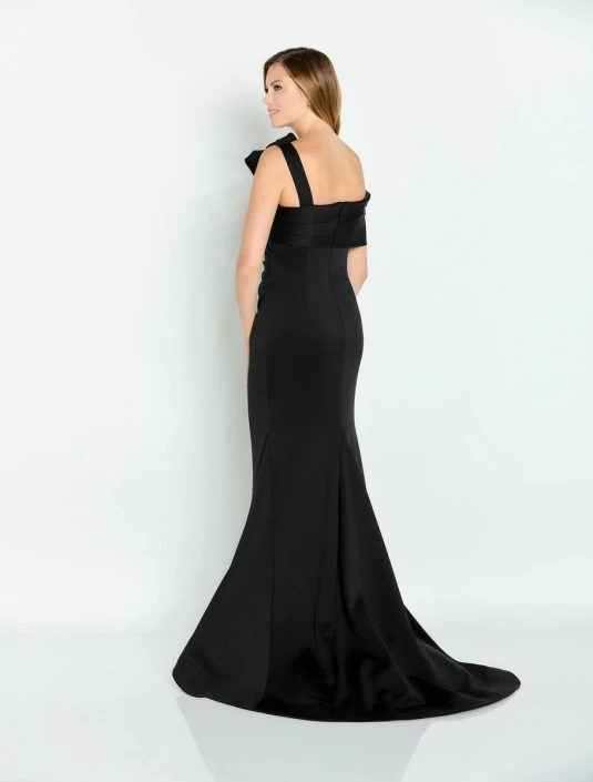 Style CB144 from Cameron Blake is a heavy stretch crepe evening gown that features one off-the-shoulder short sleeve and one on-the-shoulder strap with pleated detail, a ruched waist, trumpet silhouette, open back, train, and optional shawl.