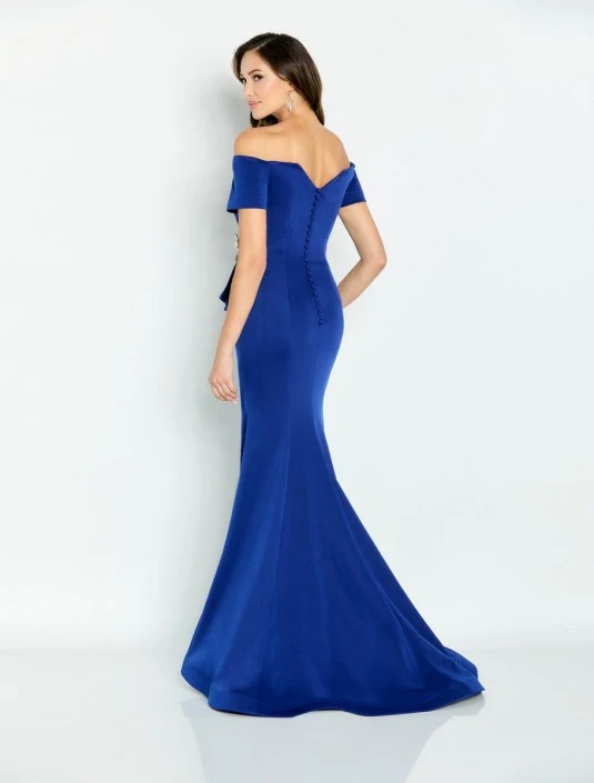 Style CB141 from Cameron Blake is an off-the-shoulder light weight scuba mother-of-the-bride gown with a sweetheart neckline, short sleeves, pleated bodice with jeweled pin, side waist ruffle, V-back with buttons, and a trumpet silhouette. Separate spaghetti straps are included.