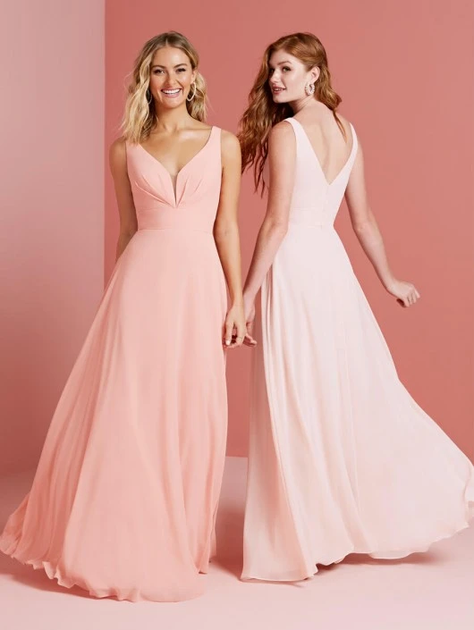 Style 22005 from Christina Wu Celebration is a sleeveless chiffon bridesmaid gown that features a flattering wide waistband and a plunging neckline with a narrow opening and a nude tulle insert to provide coverage. The modern and flowy skirt is made of semi-circle cut chiffon.