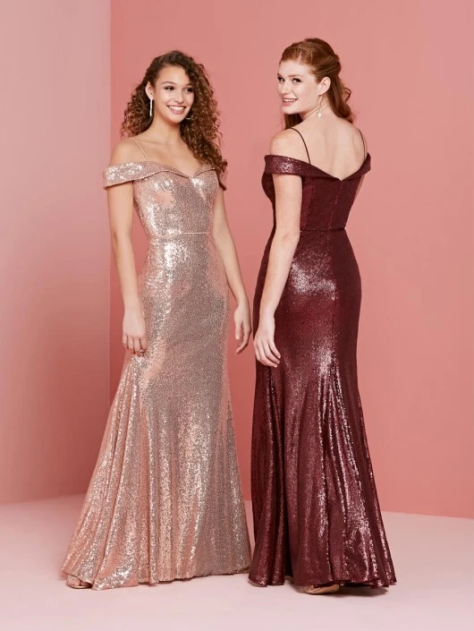 Style 22024 from Christina Wu Celebration is an all over sequin bridesmaid gown that is both sexy and sophisticated. It features a fashion forward off-the-shoulder neckline with spaghetti straps and a slim fitted skirt.