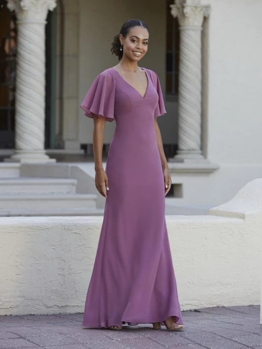 Style 22146 from Christina Wu Celebration has a feminine empire bodice and a slim soft flare skirt to accent any figure. Flutter sleeves add to the understated elegance of this V neck chiffon bridesmaid gown.