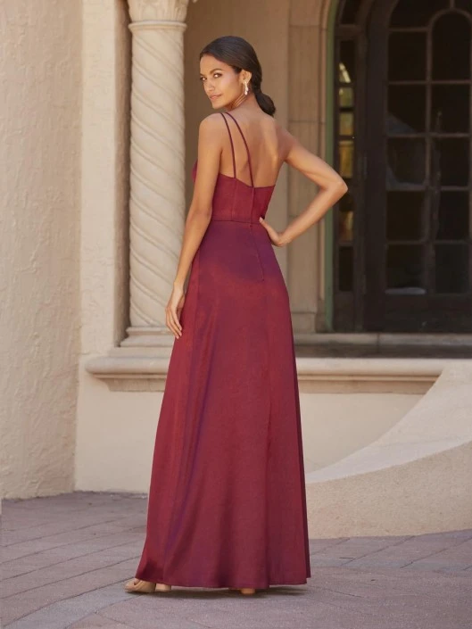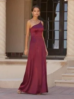 Style 22154 from Christina Wu Celebration is a bold one shoulder bridesmaid gown with narrow double straps and a slim A-line skirt with front slit. An open back with the narrow straps are a highlight.