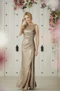 Style 22916 from Christina Wu Celebration is an all over sequin bridesmaid gown that features a sleeveless boatneck bodice and light draping across the body for a beautiful silhouette. There is a slit on the skirt and the bodice back bodice dips to a V.
