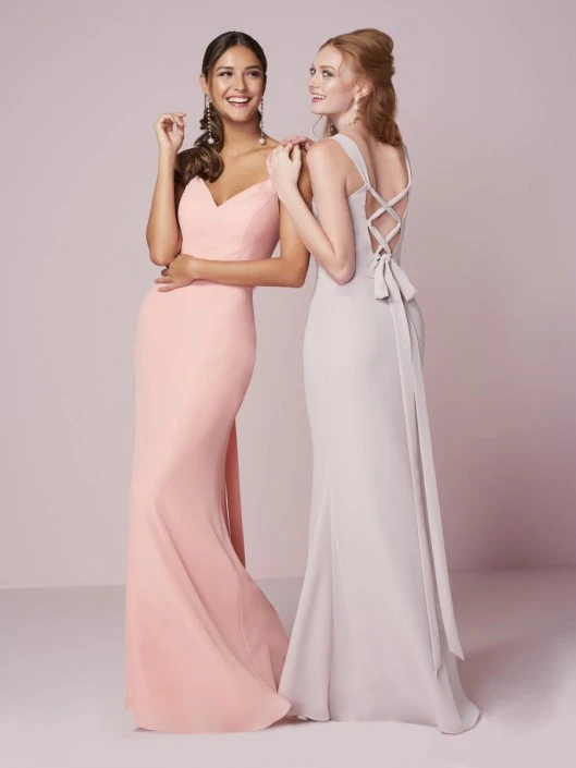 Style 22953 from Christina Wu Celebration is a chiffon fitted bridesmaid gown that has a V neckline, wide straps, and an open back that can be laced through with chiffon ties in different ways.