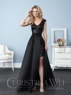 Style 22774 from Christina Wu Celebration is a gleaming short Allover Sequin bridesmaid dress that has a removable long Satin overskirt which hooks at the waistband. Available in any combination of Allover Sequin dress and Satin removable skirt.