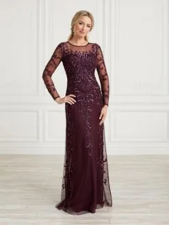 Style 17033 from Christina Wu Elegance is a slim beaded stretch mesh mother of the bride gown that has a boat neck and long sleeves, covered with intricate beadwork scattered down onto the skirt. Sheer illusion on the shoulders and sleeves.