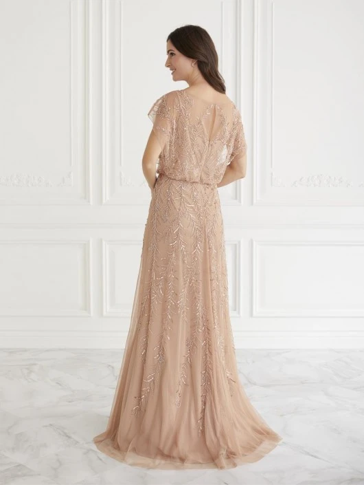 Style 17066 from Christina Wu Elegance is a gracefully draped blouson mother of the bride gown with illusion neckline and soft flutter sleeves in an allover beaded pattern.