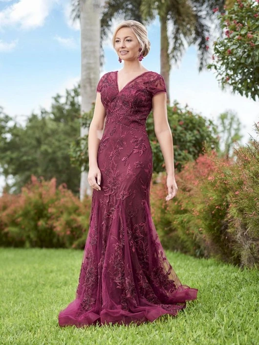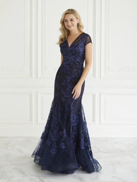 Style 17069 from Christina Wu Elegance has an embroidered floral sheer V-neckline in the front and back and sheer cap sleeves. A figure flattering fit and flare evening gown with horsehair trim for added fullness.