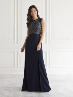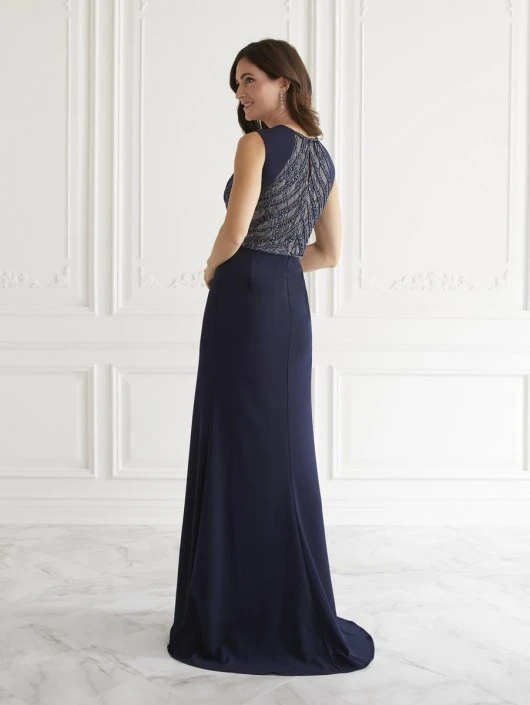 Style 17077 from Christina Wu Elegance is a couture mother?s style of crepe and beaded lace in this sleek gown inspired by vintage glamour. A diagonal contrasting pattern with a jewel neckline and beaded belt waistline provide extra coverage without sacrificing style.