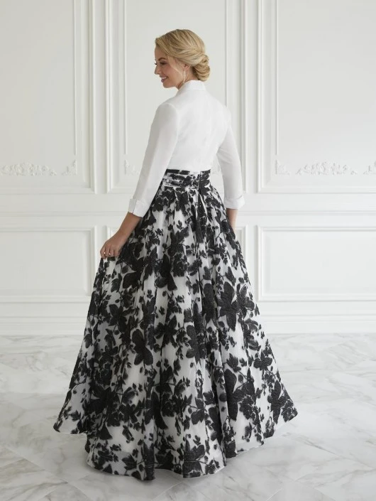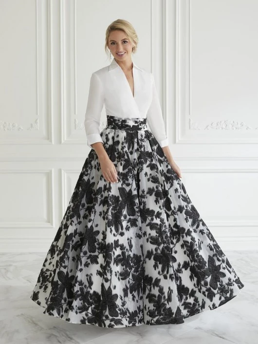 Style 17083 from Christina Wu Elegance has a timeless collared surplice bodice with three quarter sleeves in a silky taffeta. Contrasting top color on the box pleated full skirt with side pockets. The bold floral print cinches the waist with a ruched brocade belt. Perfect for this season?s celebrations.