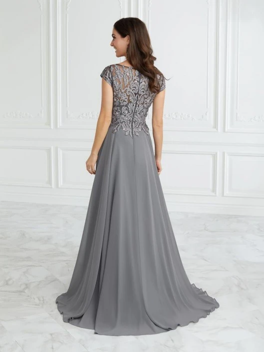 Style 17096 from Christina Wu Elegance is a classic chiffon A-line mother of the bride gown with an illusion embroidered lace bodice, V neckline, and cap sleeves.