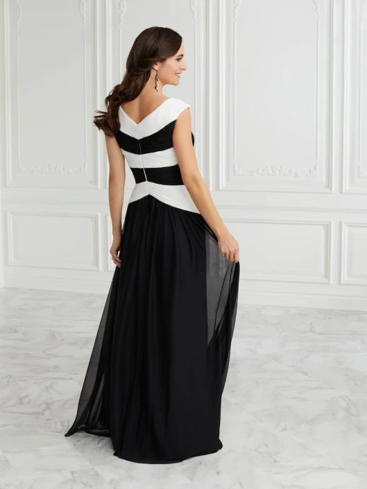 Style 17100 from Christina Wu Elegance is a slim A-line mother of the bride gown with a V-neckline draped with finely pleated stretch chiffon fabric in contrasting colors or solid Navy. Available in sizes 2-28.