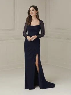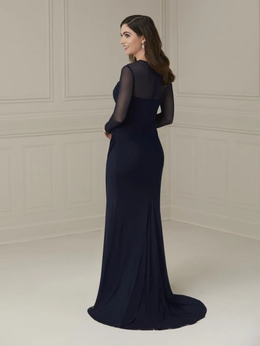 Style 17101 from Christina Wu Elegance has a scoop neckline with soft stretch mesh long sleeves on the asymmetrically pleated bodice of this mother of the bride gown. The draped skirt has a front side open slit. An illusion back with center back zipper and sweep train complete the look.