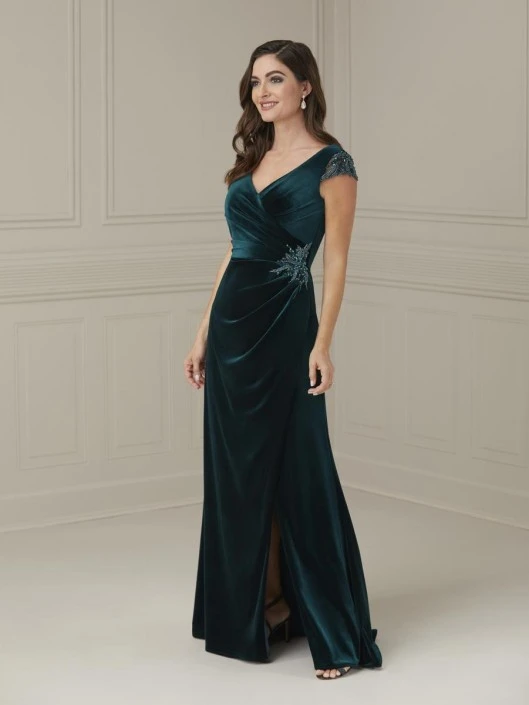 Style 17108 from Christina Wu Elegance is a slim velvet mother of the bride gown with a V-neckline and sheer beaded cap sleeves. Side front draping decorated with a beaded motif on left-hand side and a draped front side skirt slit complete the look.