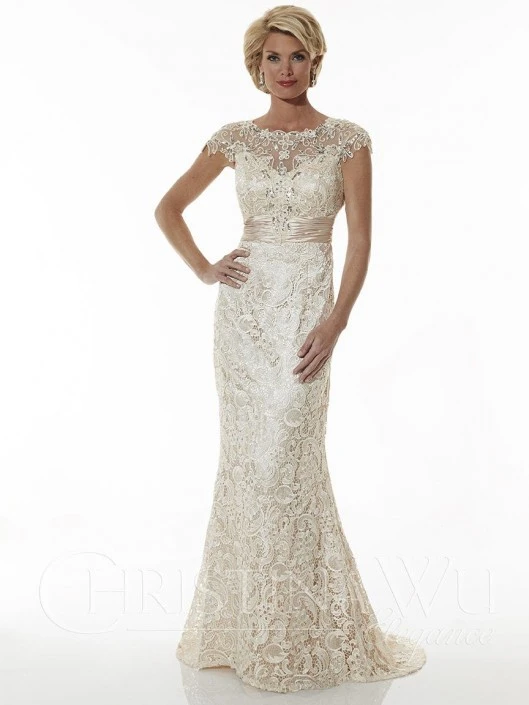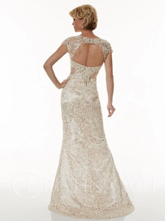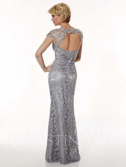 Style 20176 from Christina Wu Elegance is a Venice lace cap sleeve mother of the bride gown that has a shirred chiffon waistband and a trumpet skirt. The bodice and center front is decorated with a sequin and bead design while the sheer back has a cut out.