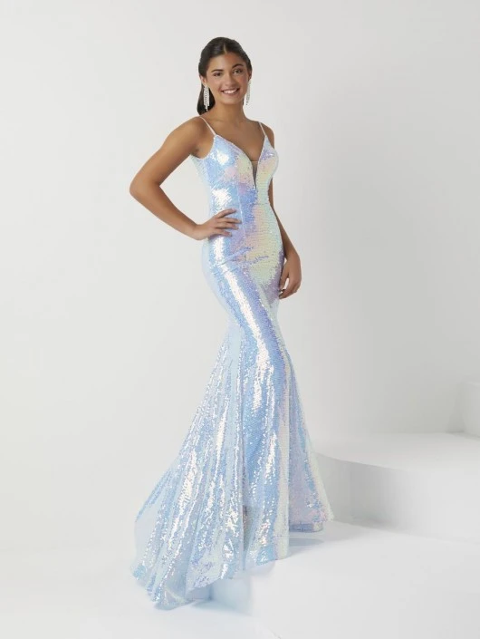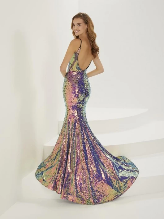 Style 16928 from Christina Wu (formerly Tiffany Designs) has shimmering liquid sequins with V-neckline and fitted mermaid skirt. Open V-back and center zipper with train.
