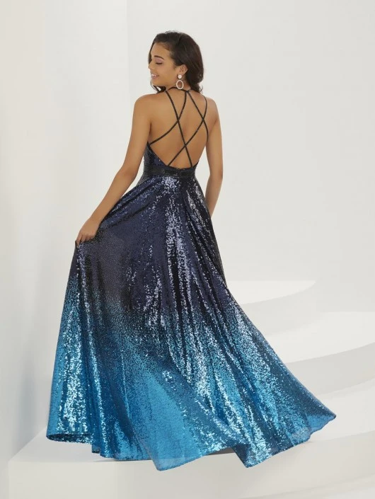 Style 16941 from Christina Wu (formerly Tiffany Designs) is a stunning ombre sequin A-line prom gown that has a V-neckline with double straps and a rhinestone waistband. The open back has cross straps and center zipper.