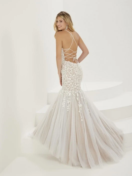 Style 16943 from Christina Wu (formerly Tiffany Designs) is a mermaid prom gown that has a V-neckline with spaghetti straps, lace appliques with heat-set stone, a sparkle tulle mermaid skirt, an open lace-up back, and sweep train.