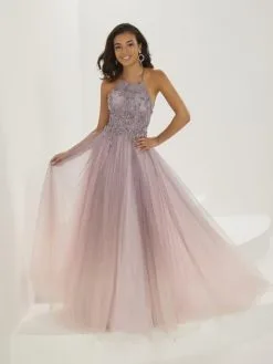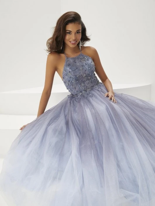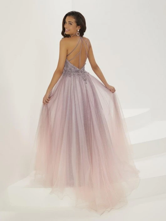 Style 16947 from Christina Wu (formerly Tiffany Designs) is an ombre sparkle tulle prom gown with a high halter neckline and spaghetti straps on the beaded bodice, an A-line skirt, an open strappy keyhole back, and sweep train.