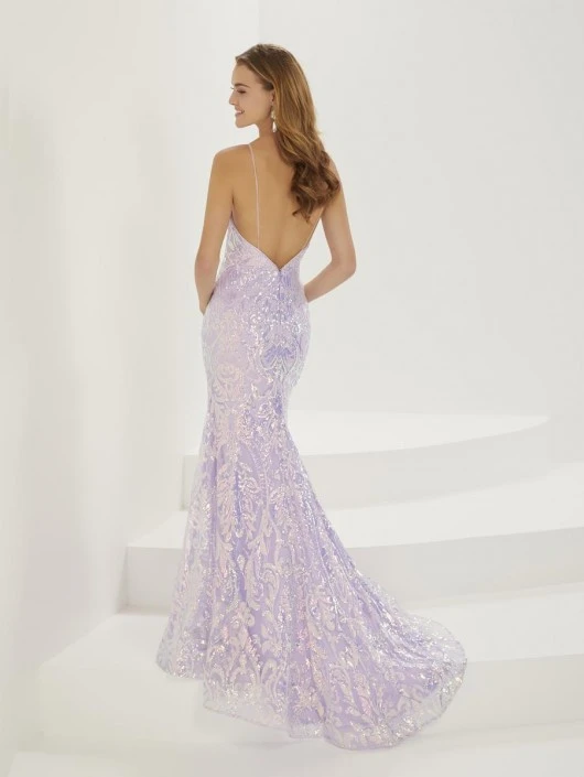 Style 16948 from Christina Wu (formerly Tiffany Designs) is a floral liquid sequin slim prom gown that has a sweetheart neckline with spaghetti straps, a front side skirt slit, an open back, and train.
