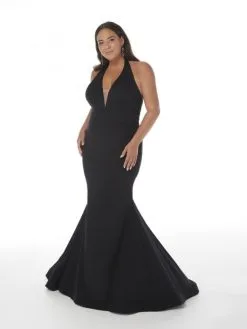 Style 16959 from Christina Wu (formerly Tiffany Designs) is a halter V neck spandex plus size prom gown with a fit and flare skirt, center zipper back, and train.