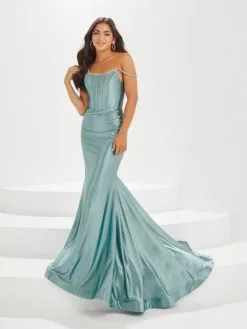 Style 16003 from Tiffany Designs by Christina Wu is a scoop neck corset bodice fitted stretch crepe prom gown that features rhinestone off-the-shoulder straps and a beautiful illusion back. Ruching detail at the waist. Center zipper back and sweep train with horsehair.