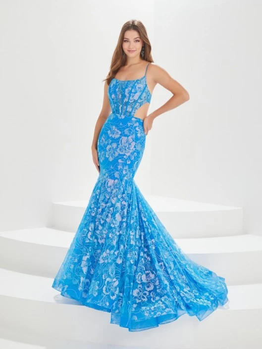 Style 16011 from Tiffany Designs by Christina Wu is a floral glitter tulle mermaid prom gown featuring a corset bodice with cut out sides and an open lace-up back. This dress is complete with a sweep train.