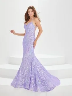 Style 16016 from Tiffany Designs by Christina Wu is a fitted trumpet prom gown in geometric sequin pattern with a V-neckline, spaghetti straps, and an open lace-up back with sweep train.