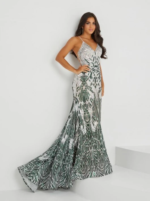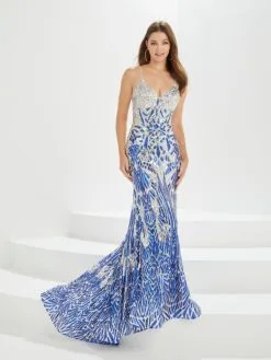 Style 16023 from Tiffany Designs by Christina Wu is a glamorous sequin patterned fitted trumpet prom gown that has a V-neckline, spaghetti straps and open lace-up back.
