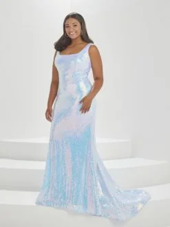 Style 16037 from Tiffany Plus by Christina Wu is a stunning square neck tank plus size fitted prom gown in all-over iridescent sequins with an open V-back. Center back zipper and sweep train.