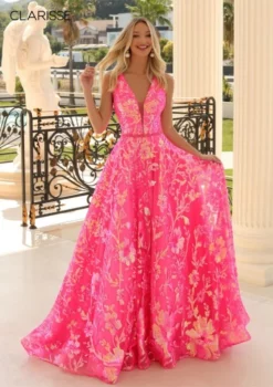 Style 810458 from Clarisse is a prom ball gown with iridescent sequins floral design, plunging V-neckline with mesh insert, beaded belt, and a deep open V-back.