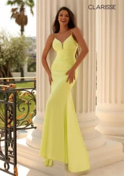 Style 810541 from Clarisse is a power jersey prom gown with a deep V-neckline with mesh insert, ruching on the bodice, spaghetti straps, cut-out lace-up back with ruching, and a train.
