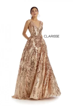 Style 5105 from Clarisse Couture is a sparkling patterned ballgown that features pockets and a sheer V-neckline, side cut outs, and an open V back.