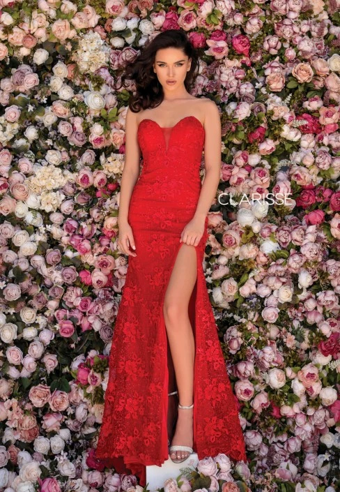 Style 5132 from Clarisse Couture is a strapless floral design mermaid gown with a sweetheart neckline, a lace up back with cut out, and a high skirt slit.