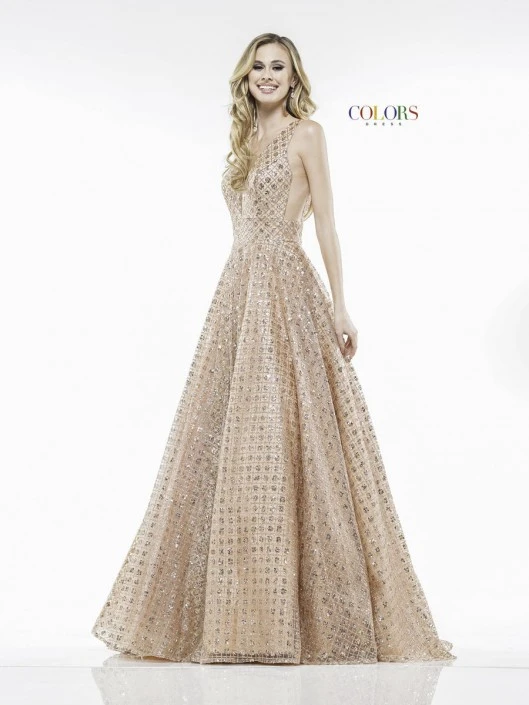 Style 2170 from Colors Dress is a sleeveless long A-line sequin gown with a deep V neckline, mesh sides. and an open V back.