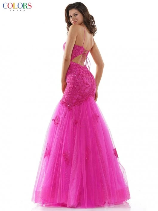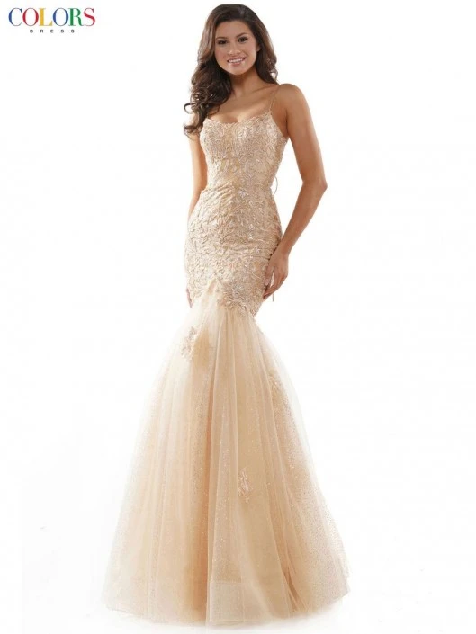 Style 2490 from Colors Dress is a sparkling lace mesh mermaid gown with spaghetti straps and cut out back with adjustable lace up. The perfect choice for your next formal event!